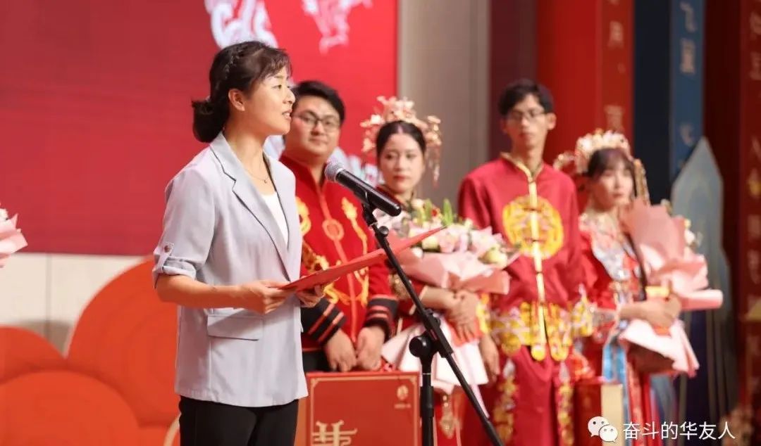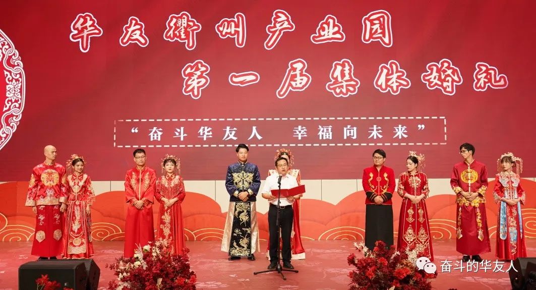會場上集團副總裁、華友衢州產業園黨委書記方圓為新人做了證婚儀式,祝福新人和美一生;集團總裁助理、新能源產業集團副總裁李天成為新人送上了鮮花,祝福新人百年好合;集團副總裁、新材料產業集團總裁徐偉代表公司為新人送上祝福紅包,祝福新人琴瑟和鳴;華友衢州產業園工會主席陸熙明代表工會為新人送上了賀禮,祝福新人長長久久;共青團衢州市委書記童舟致賀詞,祝愿新人恩愛一生共白頭。
