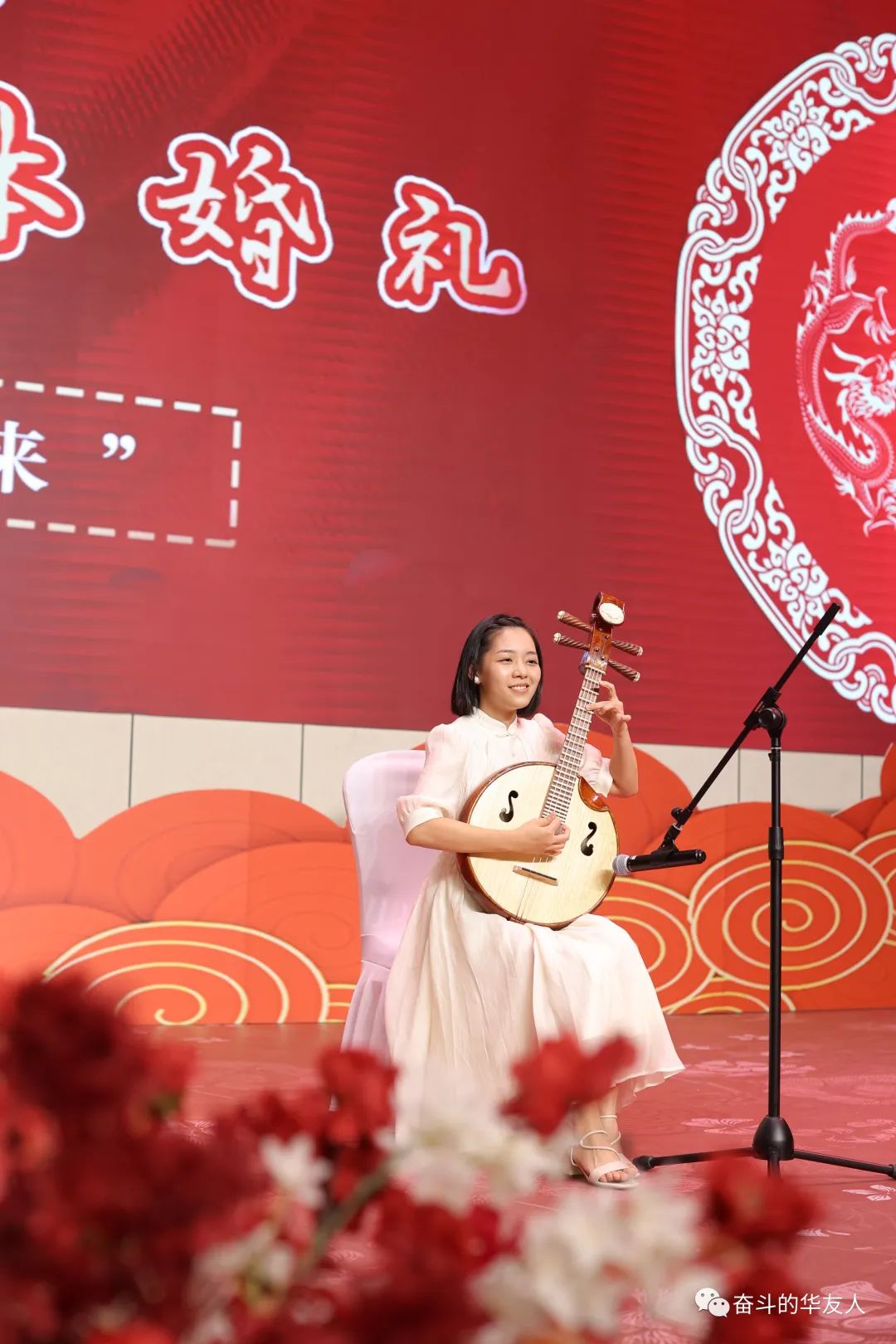 “從此刻起,你們正式成為結發夫妻,禮成!”儀式結束也把氛圍推到了沸點。大家紛紛摩拳擦掌想上臺為新人送上祝福,這邊2022屆大學生代表秦碧徽和她的男朋友姚云飛為新人獻上了一曲中阮彈唱,祝福新人幸福天長地久。那邊新娘閆寧寧一首《約定》唱出了愿得一人心、白首不相離的相約。臺上還進行了投壺、花開富貴等游戲。