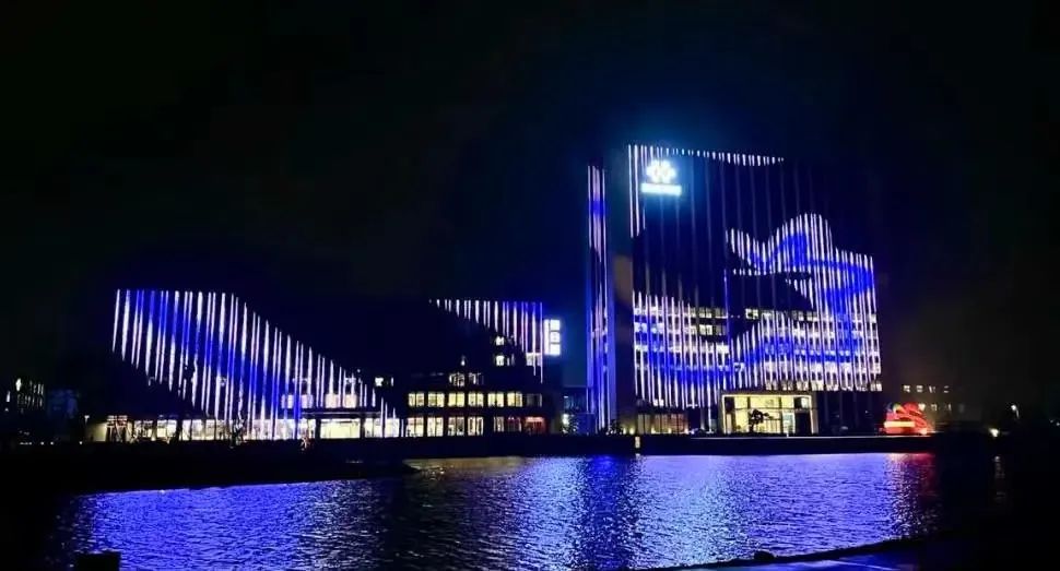 華友湖畔,夜燈長明,在黑夜的襯托下,科創大樓上華友鈷業的Logo格外明亮。華友的夜燈照亮華友的未來,華友的Logo綻放華友的光華。
