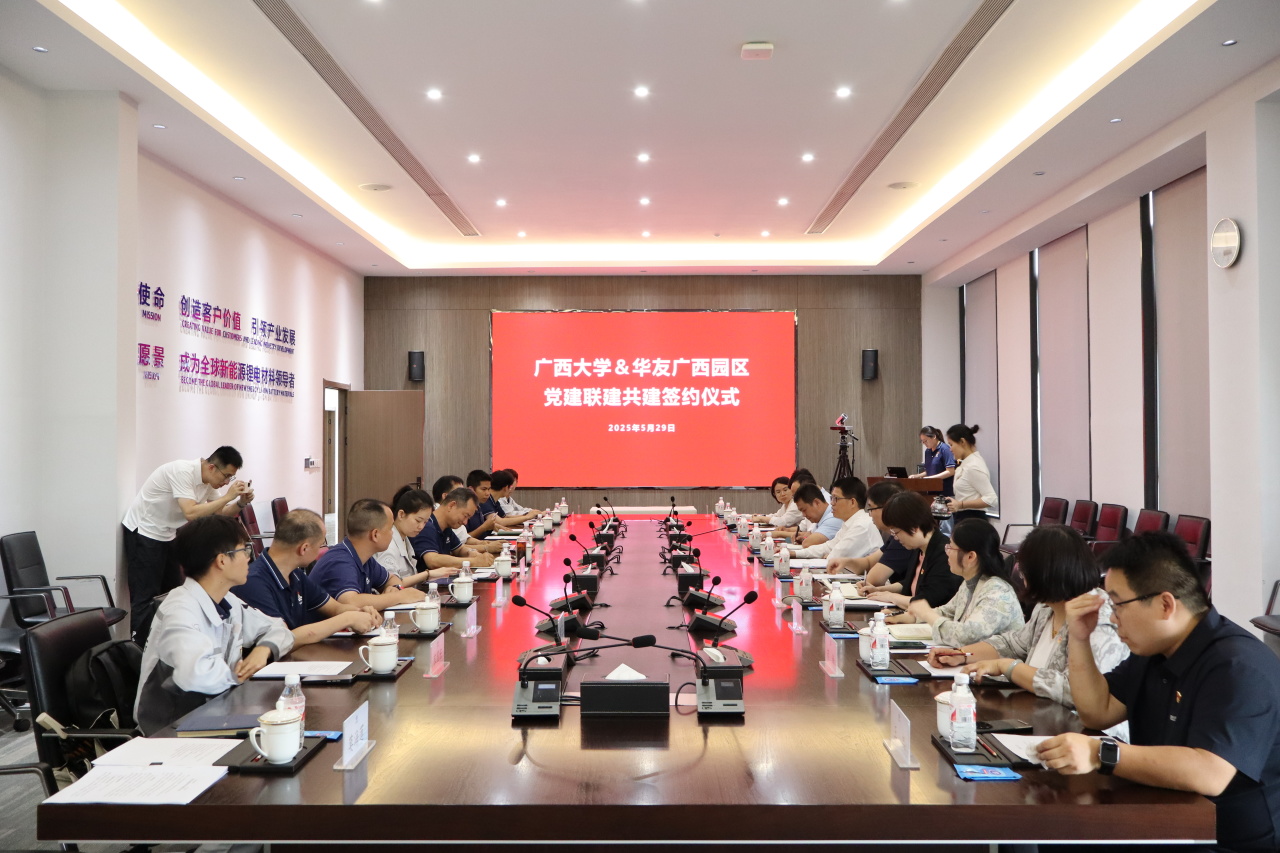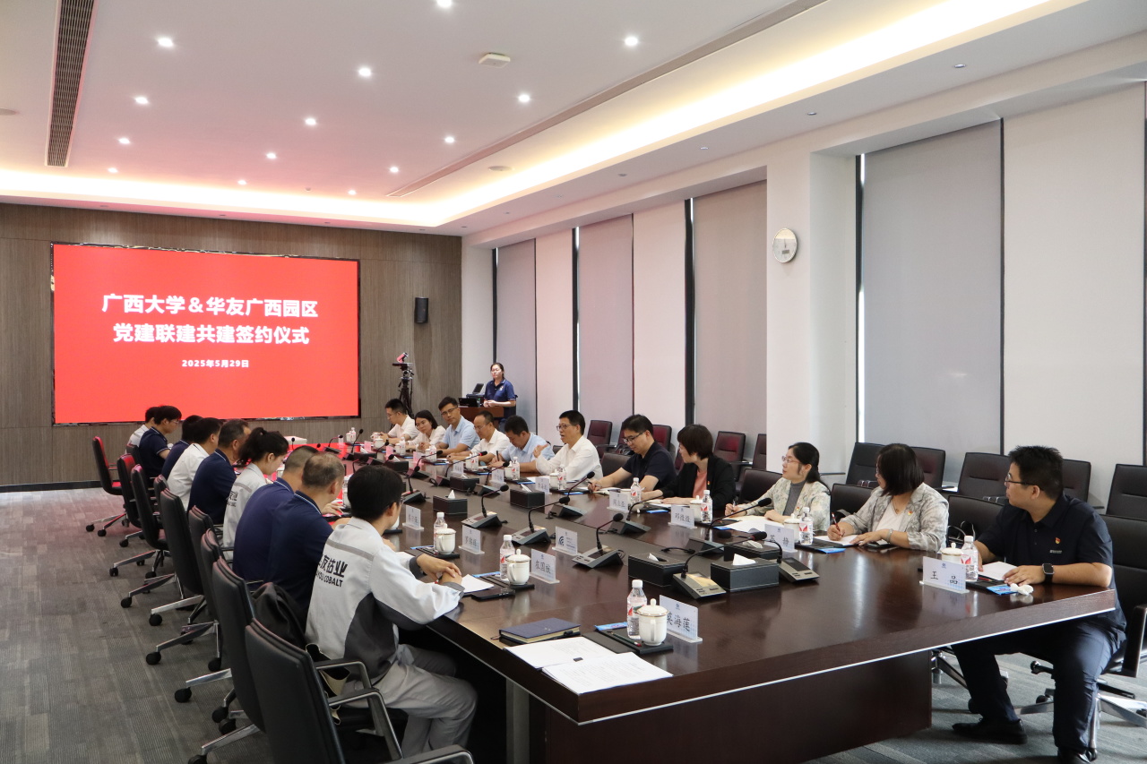 簽約儀式上,華友廣西園區(qū)黨委書記徐學(xué)良與廣西大學(xué)資源環(huán)境與材料學(xué)院黨委書記沈大強(qiáng)共同簽署黨委聯(lián)建協(xié)議,明確以黨建引領(lǐng)業(yè)務(wù)發(fā)展,推動(dòng)產(chǎn)學(xué)研深度融合,實(shí)現(xiàn)資源共享、優(yōu)勢(shì)互補(bǔ)、協(xié)同共進(jìn)。廣西大學(xué)黨委副書記寧旭初在座談會(huì)上講到,此次聯(lián)建共建是推動(dòng)基層黨組織建設(shè)走深走實(shí)的重要舉措,也是實(shí)現(xiàn)“黨建+產(chǎn)業(yè)”“黨建+教育”深度融合的創(chuàng)新實(shí)踐。