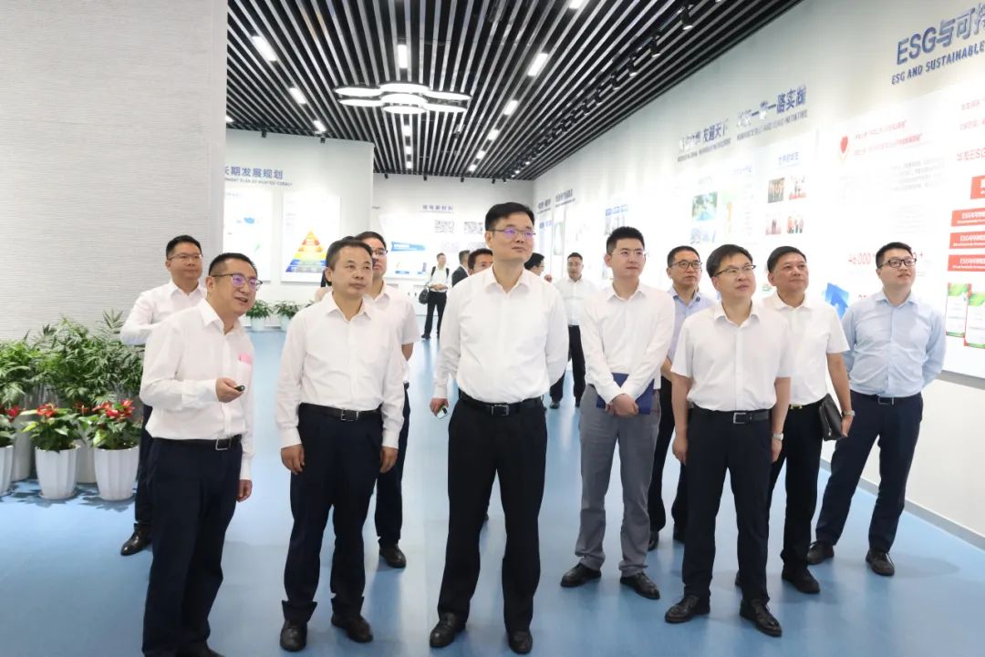 After the discussion, Zhang Tianren and his delegation visited Huayou exhibition hall and Huayou New Materials Industry Group Precursor Research Institute, to learn more about Huayou's global development history, industrial layout and future development plan. At the Precursor Research Institute, the person in charge introduced to Zhang Tianren and his entourage the construction of Huayou's precursor R&D team, the leading technology and process, as well as the R&D and application achievements in ternary precursors and sodium precursors. Zhang Tianren warmly praised the R&D environment, facilities and equipment, as well as R&D results of Huayou Precursor Research Institute, and positively affirmed Huayou's continuous breakthroughs in the field of sodium precursors and the significant results it has achieved.