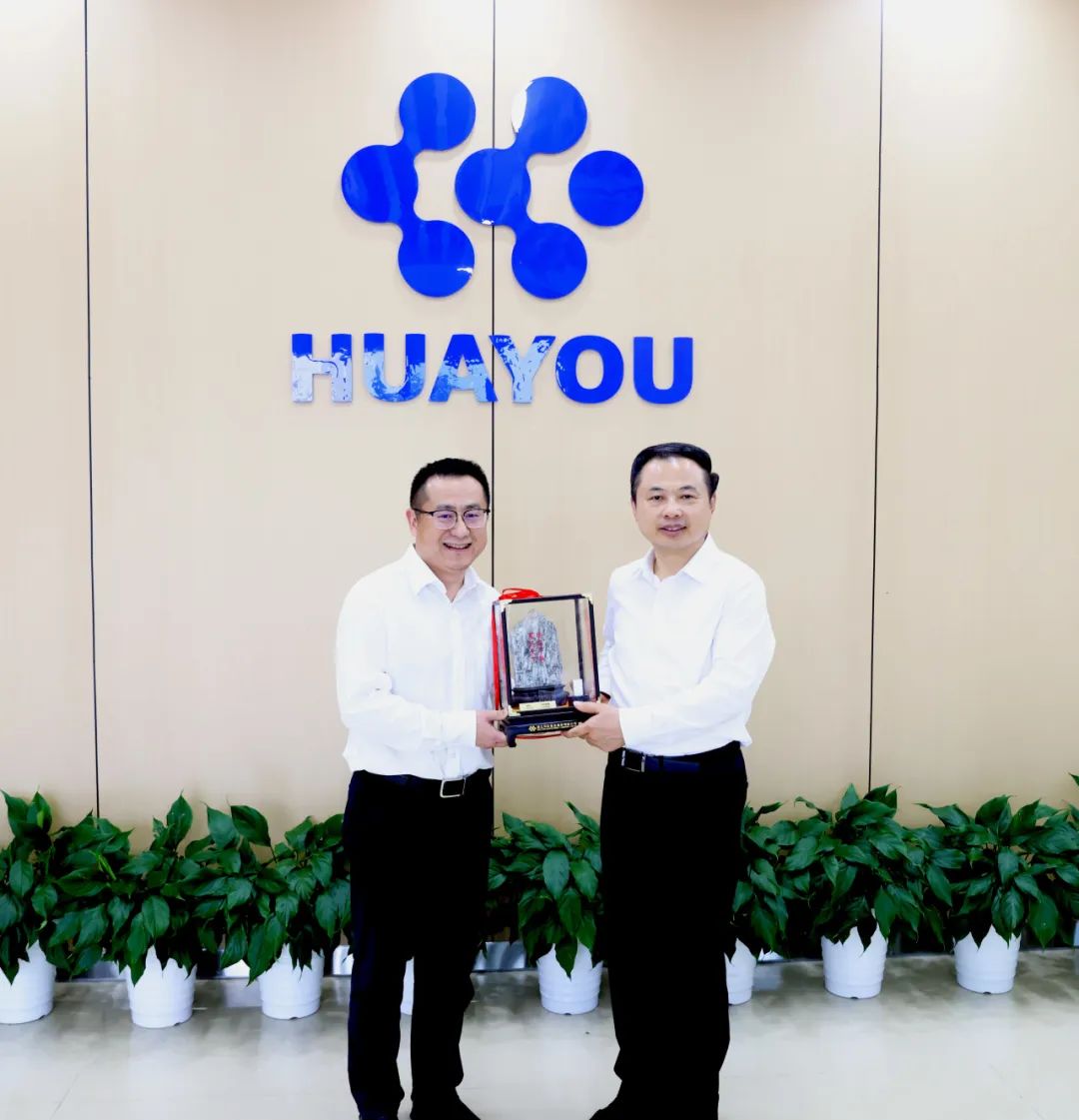 Fang Yuan, on behalf of Chairman Chen Xuehua, presented Chairman Zhang Tianren with a souvenir with Huayou's characteristics - "You Shi Tonghui". The souvenir is from Huayou's Arcadia Lithium Mine in Zimbabwe, engraved with "Rooted in China, Befriends worldwide", reflecting Huayou's national sentiment and business ideals, and lithium carbonate products produced by Huayou Lithium (Guangxi) Company are placed on one side of souvenir, which reflects Huayou's "resources overseas, manufacturing in China, and market in the world" of Huayou. Zhang Tianren inquired about the design concept of the souvenir with great interest and expressed his sincere thanks.