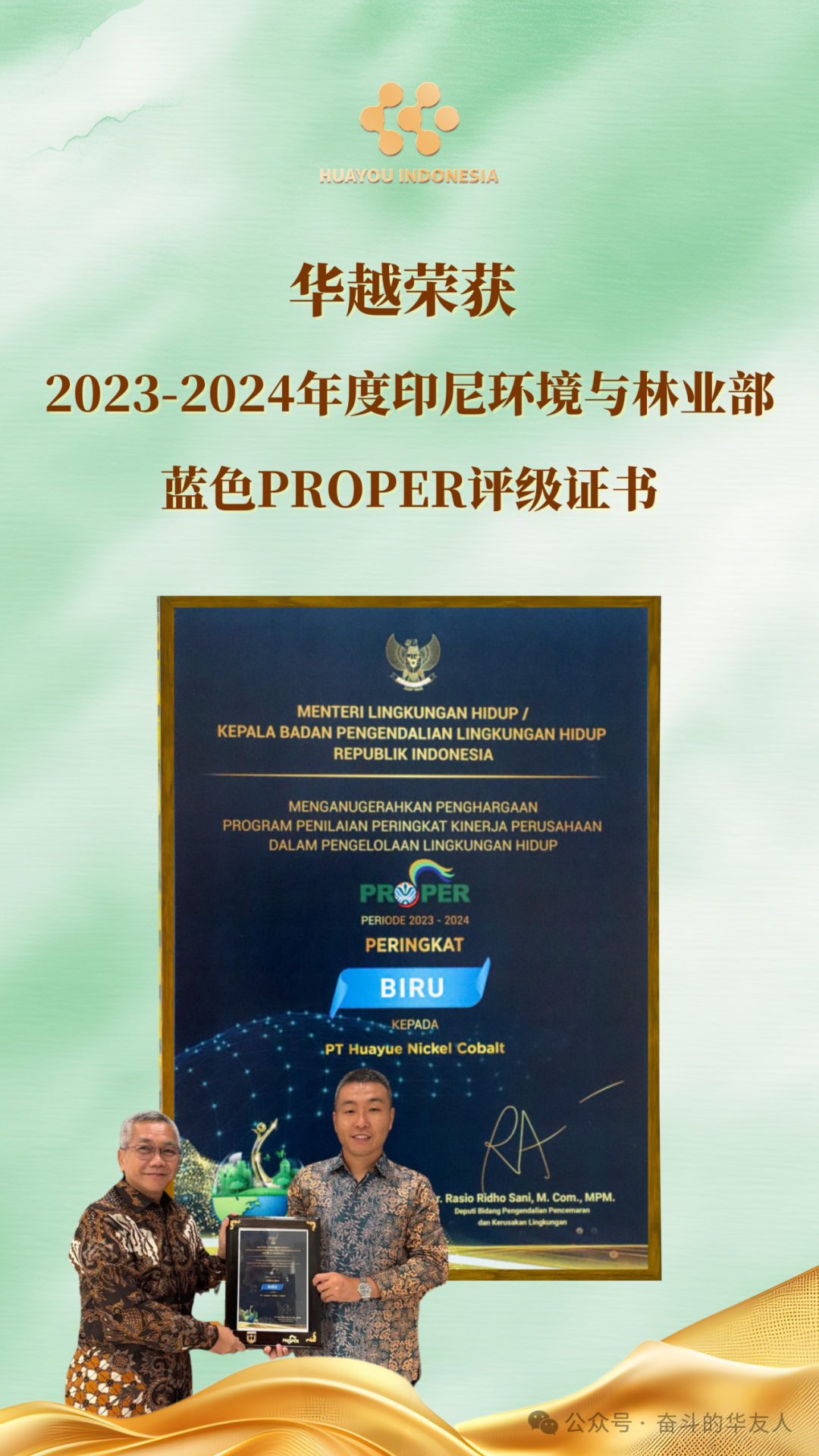 Recently, Huayue Nickel Cobalt (Indonesia) Co., Ltd. received the 2023-2024 Blue PROPER rating certificate from the Ministry of Environment and Forestry of Indonesia. The award was personally presented by Anwar Hafid, Governor of Central Sulawesi Province, in recognition of the company's compliance and performance in environmental management.