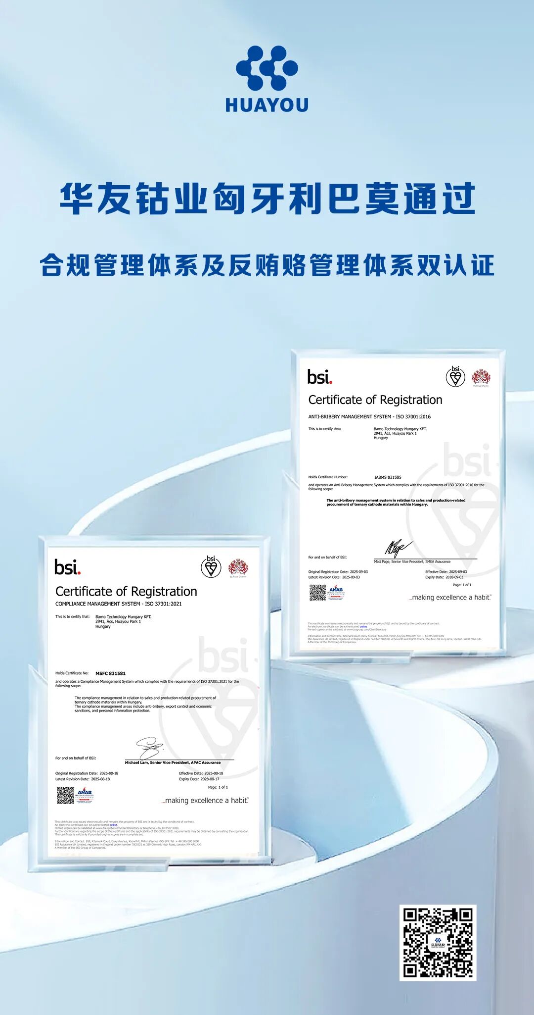 Hungary's First | Huayou Hungary Bamo Achieves Dual Certification in Compliance and Anti-Bribery Management Systems