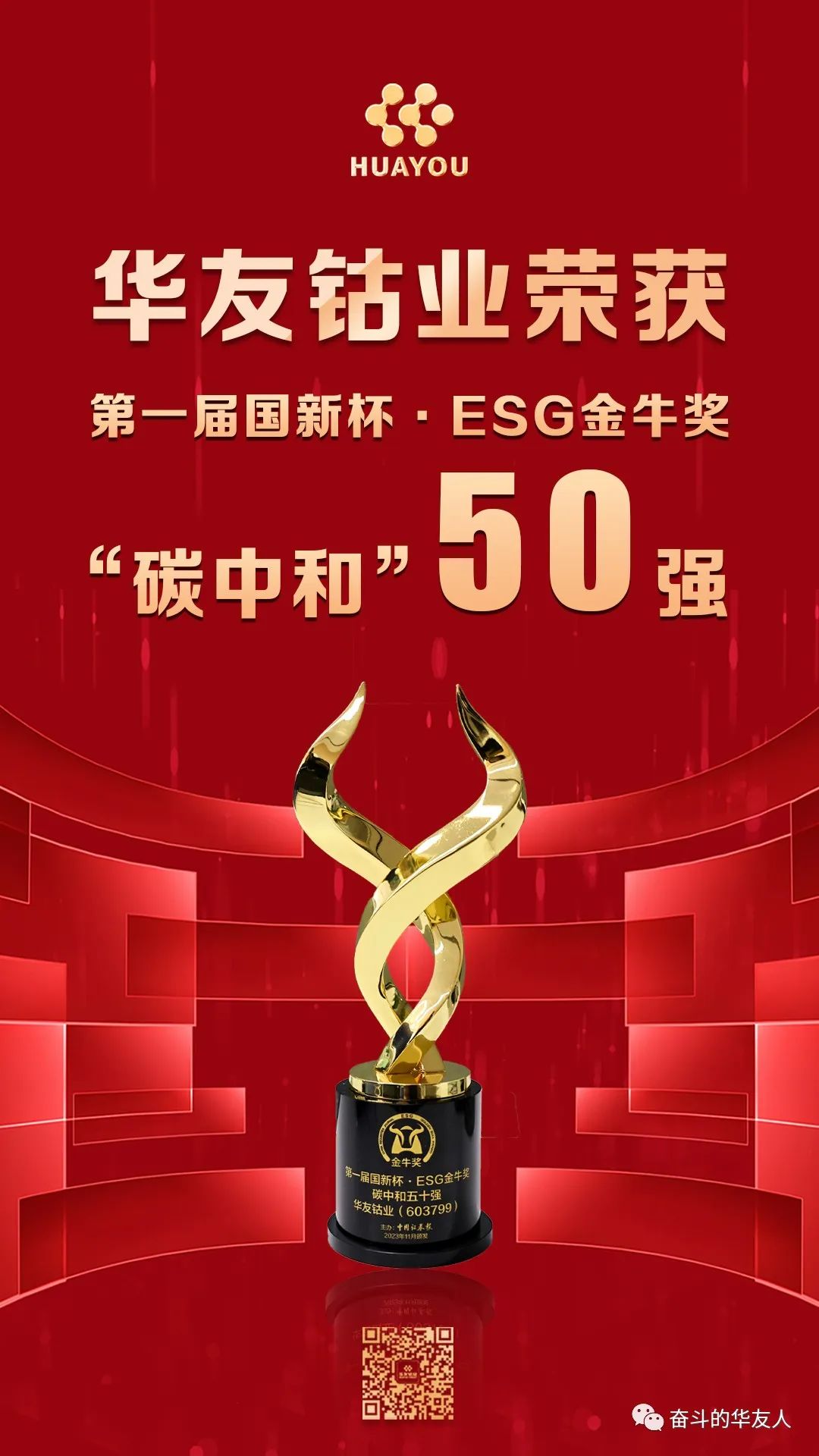 11月24日,由中國證券報、中國國新控股有限責任公司、南通市人民政府聯合主辦的“新生態新價值新成長——2023金牛企業可持續發展論壇暨第一屆國新杯·ESG金牛獎頒獎典禮”在江蘇南通舉行。華友鈷業榮獲第一屆國新杯·ESG金牛獎“碳中和”五十強。