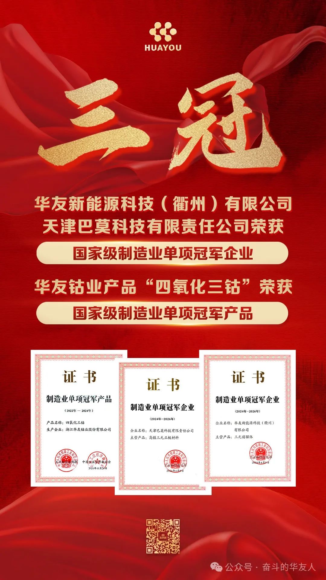 近日,華友鈷業旗下公司華友新能源科技(衢州)有限公司、天津巴莫科技有限責任公司雙雙獲得工信部正式頒發的“制造業單項冠軍企業”證書。此前,華友鈷業的“四氧化三鈷”已摘得“制造業單項冠軍產品”桂冠。