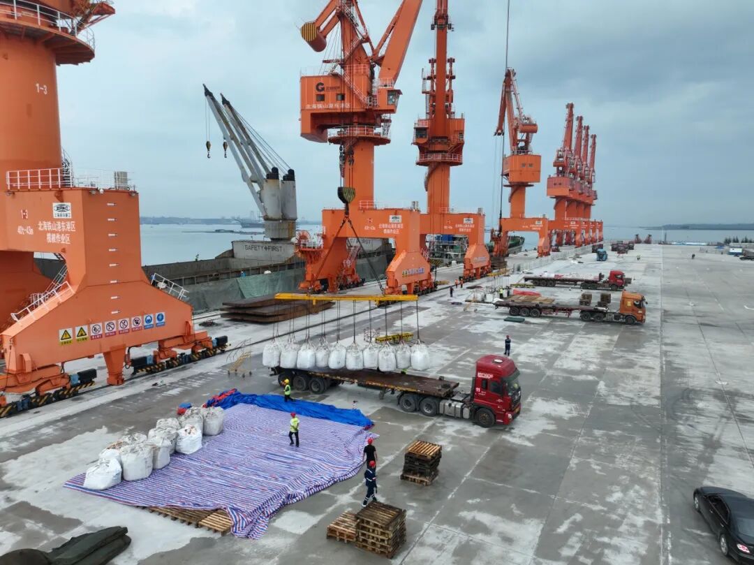 在玉林海港碼頭,工人們正有條不紊地進行緊張的裝卸作業,裝車后分批運往華友廣西園區。本次鋰精礦的成功接卸,極大提升了華友廣西園區原料供應的自主性與穩定性。相比原有路線,直接到貨玉林海港碼頭每次節省廣西華友原料運輸近100多公里陸運路程,有效降低了物流成本和運輸時間,顯著增強了園區的市場響應能力和產品綜合競爭力。這不僅是簡單的“少走彎路”,更是華友整合國內外物流資源、優化全球布局的核心體現。