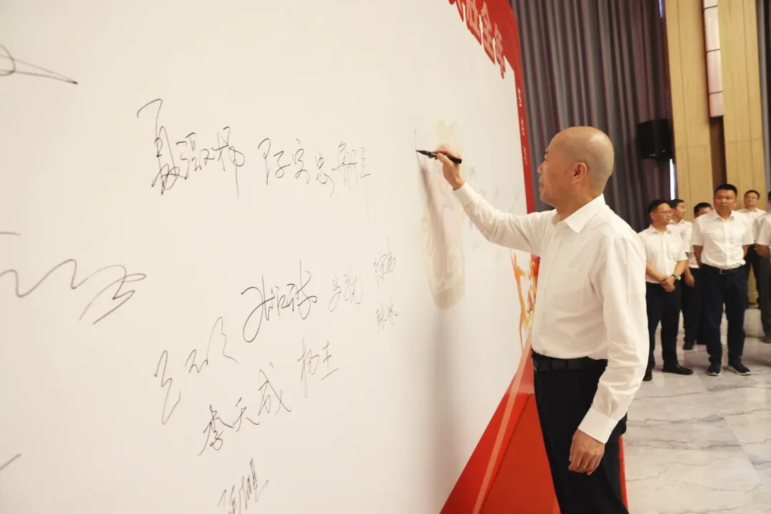 “我承諾:百日沖刺、決勝全年!華友必勝!必勝!必勝!”全體干部在陳雪華董事長帶領下莊嚴宣誓,并在簽名墻鄭重簽名。一筆一劃,皆是使命;一字一句,滿載擔當,凝聚成“使命必達”的華友力量!