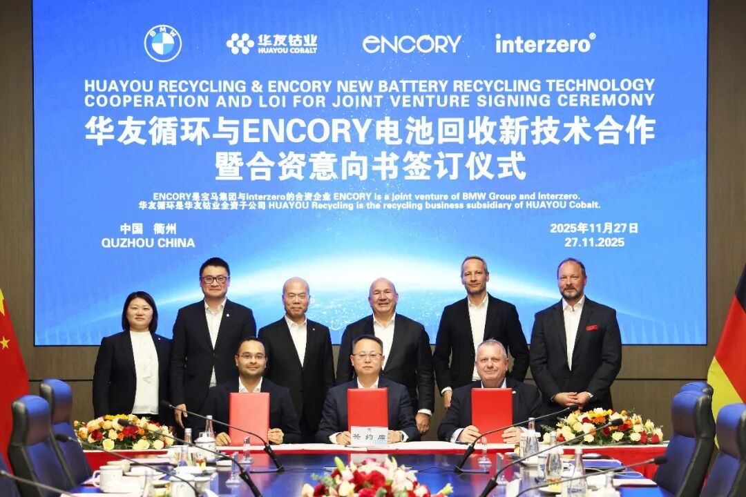 近日,浙江華友循環科技有限公司與Encory(寶科利)集團正式簽署電池回收新技術合作暨合資意向書。BMW(寶馬)集團戰略投資高級副總裁雷納·福雷爾、Interzero(茵特保)集團董事長史偉浩、華友鈷業董事長陳雪華見證簽約。