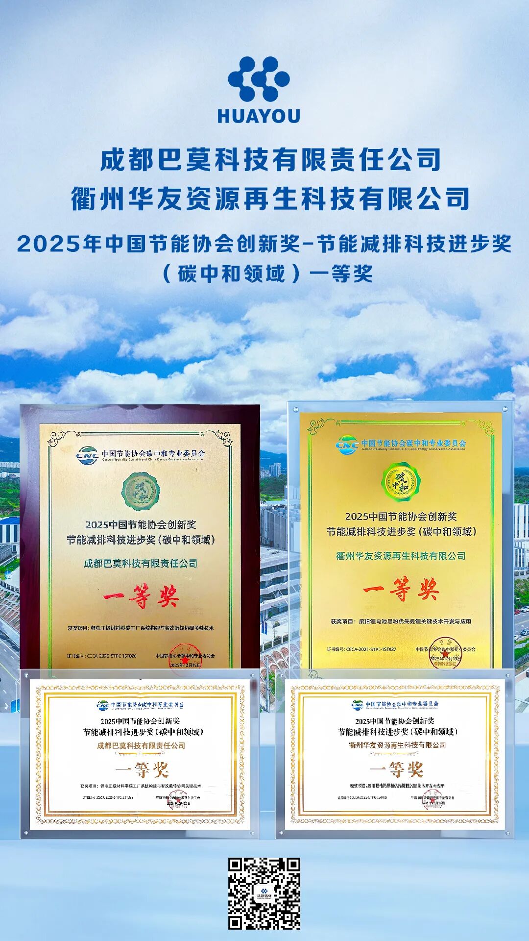 近日,在海南博鰲舉辦的中節能第五屆碳中和博鰲大會上,華友旗下的成都巴莫科技有限責任公司、衢州華友資源再生科技有限公司,憑借扎實的技術創新和亮眼的低碳實踐,雙雙蟬聯“2025年中國節能協會創新獎-節能減排科技進步獎(碳中和領域)一等獎”。這是華友立足全產業鏈優勢、攻克行業痛點的硬核實踐,每一項成果都凝聚著華友人的汗水與智慧。