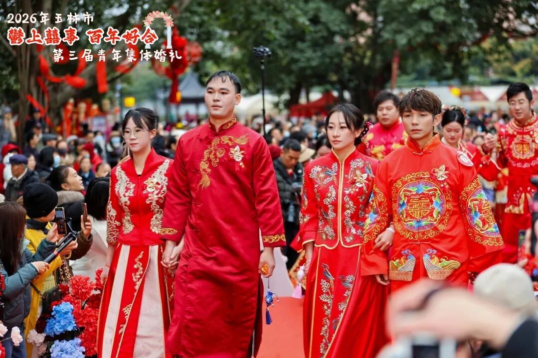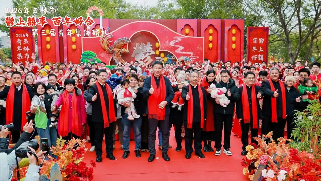 近日,2026年玉林市“鬱上囍事 百年好合”第三屆青年集體婚禮舉行,共同見證100對新人喜結連理。玉林市委書記王琛出席并為新人證婚。
